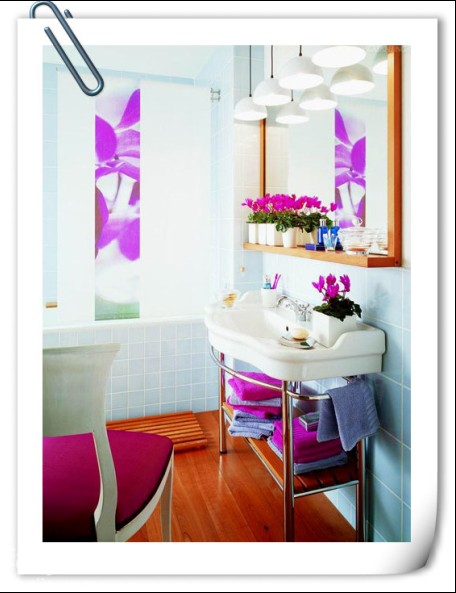 小型衛(wèi)生間的多功能設(shè)計(jì)一樣很強(qiáng)大,進(jìn)門靠左邊是一個(gè)浴室柜、面盆、浴室鏡,亮面的烤漆浴室柜易打理又防潮、防腐。紫色與白色的完美搭配,給人無(wú)限的浪漫聯(lián)想??紤]到大面積使用紫色,會(huì)使空間整體變深,可能產(chǎn)生壓抑感。所以,在色彩搭配上紫色作為點(diǎn)綴色最為保守。