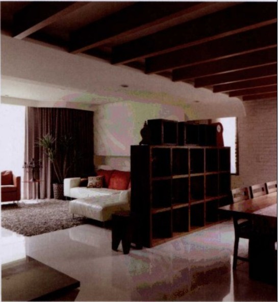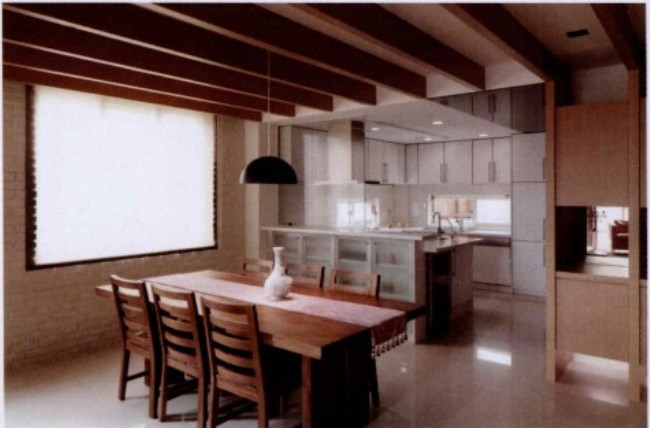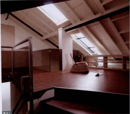 設(shè)計(jì)師運(yùn)用開放式空間規(guī)劃,減少木作的使用,以突出挑高、無(wú)壓的空間優(yōu)勢(shì),并使用環(huán)何涂料及原木地板等環(huán)保建材,不只在于健康空間的營(yíng)造,也讓受閱讀的屋主所收藏的書籍有適當(dāng)?shù)氖占{空間。保留斜屋頂,將挑高的區(qū)域規(guī)劃為閣樓,充分采光的天窗及玻璃扶手隔屏連接書房,滿足了收費(fèi)也營(yíng)造了良好的閱讀氛圍。