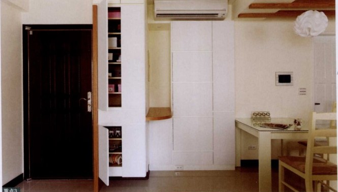 感嘆于小戶(hù)型的收納門(mén)道,每一個(gè)地方都不能放過(guò),入門(mén)柜體即為隔斷的玄關(guān)柜,同時(shí)也是鞋柜,有效地利用了空間,而延伸出來(lái)的隱藏式收納柜體,則為電器柜及收納雜物的餐柜。