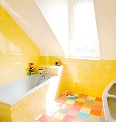 五顏六色的面磚,凸顯出衛(wèi)浴空間活躍感。面磚在陽光的照射下,使得浴室空間變得更加的鮮艷奪目。黃色的墻磚與粉色系的地磚搭配,宛如自己沐浴在一個(gè)蜜的糖果世界中。