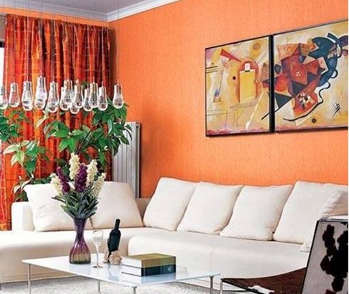 沙發(fā)背景墻面以大面積的橙色裝飾,與窗簾的色彩保持一致,改變了居室的整體視覺效果;墻面裝飾著抽象的畫框,避免大面積的背景色不會(huì)太平庸,風(fēng)格色系上也很和諧,一下轉(zhuǎn)變了客廳一角的整個(gè)感覺。
