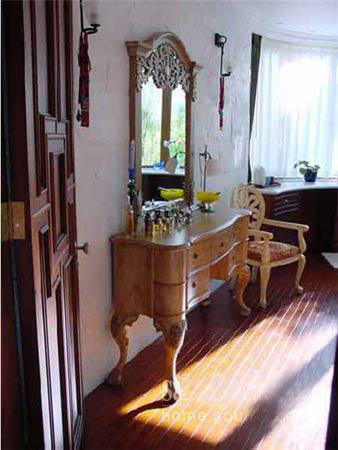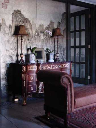 我家里的很多木制的門、書柜、櫥柜都是有呼吸、有生命的。即便有些地方刷上了大綠,別人可能會想綠色很怯,但經(jīng)我處理以后,這個綠是透明的。每一處木頭的顏色都反復(fù)做了很多遍,手撫摩的時候非常有質(zhì)感。有些人看了以后說:´噯,你這不錯,我也學(xué)學(xué)。´我告訴他們怎么弄的,都回去做了,結(jié)果沒一個人做出來是這意思。知道為什么嗎?──偷懶!中國人怕麻煩,各行各業(yè)都想省事。我這個漆反復(fù)打磨了7、8次,干了,砂輪磨掉,再用很淡的水彩顏色刷,漆了一個月??伤麄?天就干完了,一共才刷了2、3回。工序到不了,不來這效果。要想讓木頭不是´死´的,就要用很豐富的顏色沁在木頭里面,反復(fù)摩擦反復(fù)吃進(jìn)去,就像畫油畫一樣,反復(fù)畫很多層和你只畫一遍出來的質(zhì)感是不一樣的。