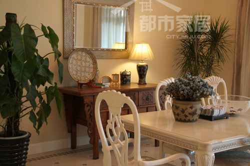 餐廳是中西合璧的典型,兩大件風(fēng)格迥異的家具在這里聚合,白色的歐式餐桌椅和棕色的中式木邊幾,你不讓我,我不讓你,各有各的獨(dú)特魅力。同樣的柔美曲線,同樣的精細(xì)雕花,展現(xiàn)的卻是完全不同的文化底蘊(yùn)和審美情趣,讓用餐的人不會感到絲毫的單調(diào)和冷清。