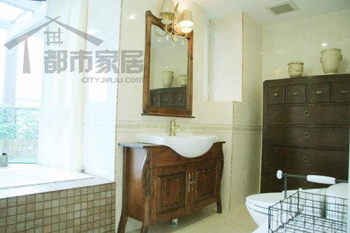 衛(wèi)浴間擔(dān)負(fù)著諸多現(xiàn)代化的實(shí)用功能,原本小編以為這里會是以簡約風(fēng)格為主導(dǎo),沒有太大的驚喜,但沒想到這里居然被中式風(fēng)格占了上風(fēng)!鏡子、浴室柜、收納柜統(tǒng)統(tǒng)都是古香古色的中式家具,不僅風(fēng)韻十足,實(shí)用性也毋庸置疑。設(shè)計(jì)師告訴小編這些家具都是從潘家園一帶淘回來的,業(yè)主很對此很是欣賞呢!