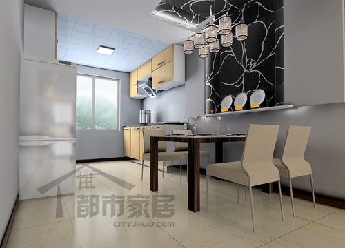 來到餐廚一體的空間,由于空間面積所限,設(shè)計(jì)師沒有再做隔斷,怎樣有效地實(shí)現(xiàn)空間劃分呢?餐廳用的是黑色花紋石材作為墻面裝飾,廚房用的是淺藍(lán)色鋁合金吊頂,從顏色和材質(zhì)上區(qū)分了餐廚空間。在一片淺淺的顏色中,黑色強(qiáng)調(diào)了餐廳在這一空間的主體地位。