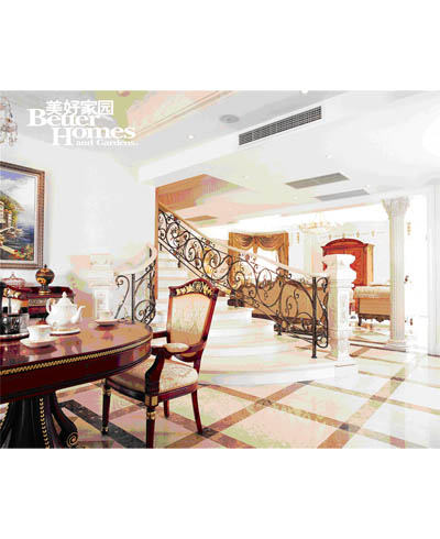 圖5:正常的樓梯踏步高度為16 厘米,設(shè)計(jì)師將其改為12 厘米,降低高度,拉寬踏步,以人為本的設(shè)計(jì),使用更加舒適。將樓梯整體延長(zhǎng),開(kāi)端的喇叭口設(shè)計(jì)成就大氣尊貴的風(fēng)范。