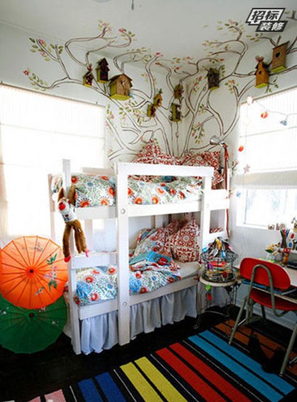 一看就知道家里有兩個可愛的小公主,上下床的設(shè)計將她們放在一起,一起分享關(guān)于成長的日記。房間色調(diào)干凈明亮,鮮艷的色彩脫穎而出,吸引大家的視線。美麗的手繪背景墻面則是大亮點,從角落延伸出去的枝干和綠葉花蕾的點綴,以及不同位置的各異鳥籠,讓白色的墻壁變的鳥語花香,具有很強的童趣設(shè)計。