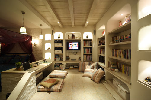 日式榻榻米風(fēng)格與地中海風(fēng)格將客廳和睡房區(qū)域在沒有隔斷的空間中分開,開放式的空間依然可以一目了然地表現(xiàn)不同區(qū)域的功能劃分。而木質(zhì)的白色書架、分割區(qū)域的地中海式白色矮墻、還有淡米色的榻榻米都可以和諧融為一體。