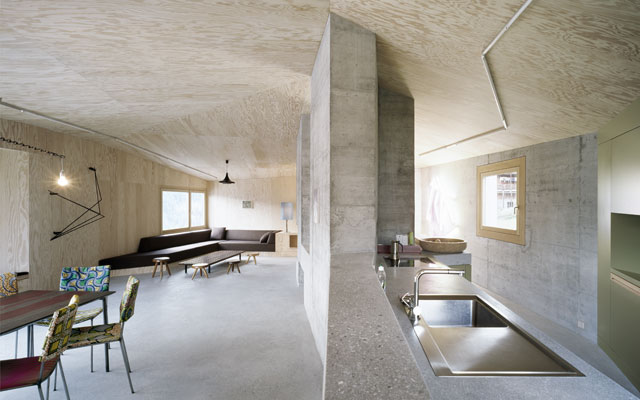 只需要在玻璃上寫些什么就可以打破它的透明感,改變視角。內(nèi)部的空間是靈活的:隔板和洗手池是水泥的;天花板和起居室的表面是用打蠟的美國冷杉做的。深淺不同的灰色調(diào)地板經(jīng)樹脂處理過,既美觀又實用,保養(yǎng)方便,帶著工業(yè)的氣息。眾多表現(xiàn)元素和建筑元素的疊加給人帶來單純的感動:本質(zhì)的柔軟和水泥的冷淡帶來的效果令人吃驚。