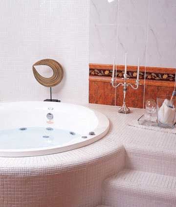 在衛(wèi)生間內(nèi)砌一個(gè)高出地面60厘米左右的地臺(tái),將浴缸安置其中,地面與平臺(tái)用二到三級(jí)臺(tái)階連接??梢栽诘嘏_(tái)上拿取自如之處,擺放經(jīng)常翻閱的書籍、小音響,甚至一瓶紅酒也不過分,得天獨(dú)厚的氛圍,本來就是泡澡時(shí)分的錦上添花。地臺(tái)式浴缸非常適合敞開式衛(wèi)生間,用地臺(tái)取代主臥與主衛(wèi)之間的非承重墻,演繹浪漫的私密空間。
