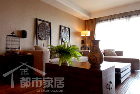 客廳古香古色的陳列品是最大的亮點。近處帶一對銅耳的老式木箱、彩陶花瓶、竹制鳥籠都是典型的中式風(fēng)格配飾。遠(yuǎn)一點的亞麻色沙發(fā)和幾何形茶幾屬于現(xiàn)代簡約風(fēng)格。相近的顏色讓跨越時代的兩種風(fēng)格完美結(jié)合在了一起。
