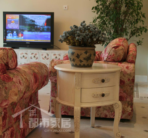 和玄關(guān)不同,客廳呈現(xiàn)出明顯的西式風(fēng)格。粉色花朵圖案的沙發(fā)有著甜膩膩的女性氣質(zhì),讓人聯(lián)想起女主人熱情的邀請和溫柔的款待。白色的雕花小矮柜氣質(zhì)優(yōu)雅,它的白色調(diào)和了沙發(fā)的甜膩感,給人眼前一亮的感覺。電視柜則像是沙發(fā)和小矮柜的中和品,有著白的底色和粉粉的手繪圖案。這一切搭配在一起散發(fā)出歐式田園的浪漫感覺。