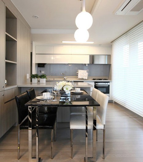 L型的飯桌腳設(shè)計(jì),讓飯桌更加堅(jiān)實(shí)牢固。大面積的落地玻璃窗,讓飯廳的采光更好,讓空間看起來更加寬敞開闊。假如家的坐向不理想,加入白色的百葉窗,阻擋部分陽(yáng)光的同時(shí)部分陽(yáng)光還是能滲透室內(nèi)。圓形的吊頂讓光線的涉及范圍更加大。