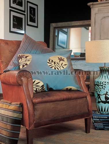 為高級(jí)而古老的真皮坐椅搭配靠墊,具有中國(guó)詩(shī)畫(huà)韻味的圖案成為獨(dú)特而高貴的選擇。清雅的灰色透露著濃縮的文化韻味,與另一個(gè)灰色緞面靠墊搭配起來(lái)更顯高貴,而坐椅旁邊的條紋靠墊向古老的氣氛中投入了古典的西方元素,讓整個(gè)角落的風(fēng)格多元起來(lái)。