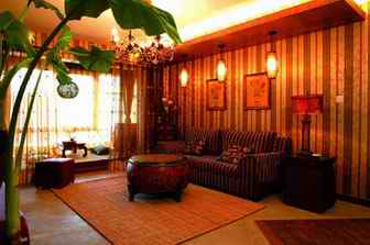 當(dāng)?shù)氐娘椘芳凹揖佣酁槭止ぶ谱?,?gòu)思造型奇特富于靈氣鄉(xiāng)土氣息濃重。東南亞元素最能體現(xiàn)物我相融的境界,自然的闊葉植物、鮮艷的花卉、寓意美好的蓮花是人們的最愛。在一間充滿熱帶風(fēng)情的居室中,用大花墻紙可以使居室顯得緊湊華麗,這種圖案元素來自東南亞的服飾設(shè)計,比如華麗的衣衫或鞋子,另一方面則出自對熱帶植物的遐想。這種花型的表現(xiàn)并不是大面積的,而是以區(qū)域型呈現(xiàn)的,比如在墻壁的中間部位或者以橫條豎條的形式呈現(xiàn)。同時圖案與色彩是非常協(xié)調(diào)的,往往是一個色系的圖案。東南亞風(fēng)格的圖案設(shè)計是有其代表性元素的。