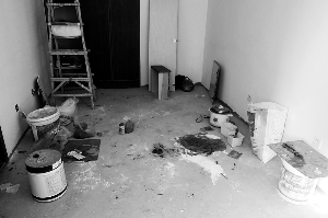 衛(wèi)生間內(nèi)已經(jīng)刷了一層防水,未干。臥室房間已經(jīng)用水泥找平,等待鋪地板,地面干凈,未見(jiàn)雜物。