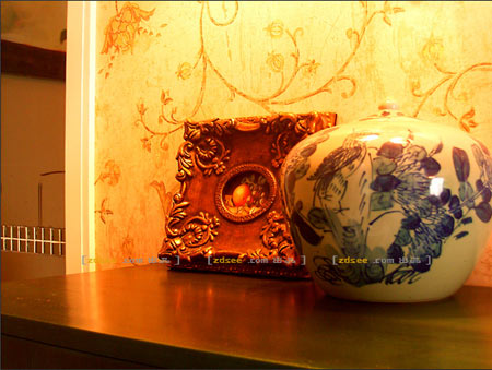 客廳中設(shè)計(jì)了幾段眉檐,它們并沒(méi)有連綿不斷,而是錯(cuò)落有致的斷開(kāi),制造了一種殘?jiān)珨啾诘囊饩场I嘲l(fā)旁的冰箱上方設(shè)計(jì)成涼亭狀,恰似戶外花園的景致。墨綠色的家具,有點(diǎn)復(fù)古,有點(diǎn)張揚(yáng),又有點(diǎn)刁巧,仿佛讓人感覺(jué)回到了原野上。客廳的吊扇燈,復(fù)古的精致雕花,展現(xiàn)優(yōu)雅、細(xì)膩的風(fēng)情。
