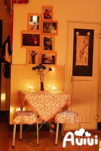 餐廳,無(wú)一幸免,所有的東西都穿上了漂亮的小碎花布?;ㄆ坷锏乃{(lán)色妖姬是用紙疊的,上大學(xué)時(shí)在風(fēng)信子學(xué)的。嘻嘻,偶爾來(lái)個(gè)燭光晚餐,屋雖小生活卻也溫馨浪漫。
