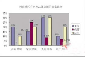 圖表說(shuō)明:在本次調(diào)查中,參與調(diào)查的商家分別是重慶的45位商家,成都的50位商家,昆明的50名商家。其中成都沒(méi)有商業(yè)照明 的商家表示要更換品牌,而重慶和昆明經(jīng)營(yíng)光源電器的商家要更換品牌的呼聲最強(qiáng)烈,高達(dá)的30%商家表示要更換品牌。