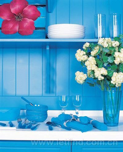 為廚房打造大海般蔚藍(lán)和寧靜,除了以藍(lán)色櫥柜為基調(diào)外,還需要沿用藍(lán)色的餐廚用具:藍(lán)色的碗、藍(lán)色的盤子、甚至用餐時(shí)握在手中的餐刀、餐叉和小勺也是選擇藍(lán)色手柄的產(chǎn)品。從廚房的餐桌,把每一種物件的顏色都統(tǒng)一起來,打造出純美、浪漫的整體風(fēng)格。