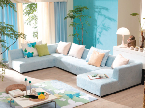 現(xiàn)正值春夏交接之際,人們的心情都比較容易煩躁。過艷或過重的顏色都會給人的視覺帶來很大的沖擊感,從而加重內(nèi)心的煩躁感。家中的顏色最佳為乳白色、象牙色、白色三種顏色,因為這種色系與人的視覺神經(jīng)最適合。所以在這個婚房設(shè)計中我采用了白色作為主色調(diào),而背景墻選用了藍色的壁紙,因為藍色是色彩中比較沉靜的顏色,是一種令人心境暢快的顏色。同時它還象征著永恒與深邃。背景墻的L形造型與客廳中的L形沙發(fā)交相呼應(yīng),加上水晶燈的造型給人營造出一種時尚的感覺。在餐廳的造型用色上,選用了藍色的互補色橙色,使整個客廳的色調(diào)達到和諧。