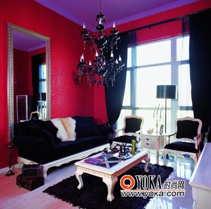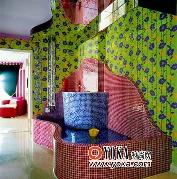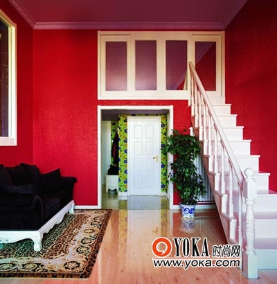 大廳的墻是紅色,很扎眼,但家具是白色的,窗簾是黑色的,這幾種顏色搭配起來特別鮮明。樓道吉米選擇綠配紫,屬于對撞的顏色里最沖突的,吉米說只有這樣才會把主題包括主人的個(gè)性充分表達(dá)出來,非暖即冷,反正不會選擇中庸。