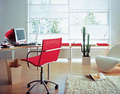 為了直接利用自然光源,我們可以把工作區(qū)安排在窗前,如果是朝南的房間,光線會比較強(qiáng)烈,我們要么用窗簾調(diào)節(jié),要么把工作區(qū)側(cè)放或靠后。但是我們應(yīng)該考慮到電腦屏幕的反光問題,而把位置安排在窗戶兩側(cè),離窗稍遠(yuǎn)的墻邊。不過對于遠(yuǎn)離窗口的空間,由于光線比較暗淡了,我們最好用來安排輔助區(qū)的活動。