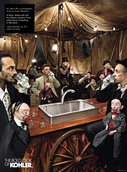 初看Kohler的這幾組雜志廣告,首先是被畫面豐富的故事性所吸引,然后才注意到產(chǎn)品——這與一般廣告突出產(chǎn)品的做法極為不同。同時,與一般強調(diào)產(chǎn)品清潔干凈質(zhì)感的表現(xiàn)方法不同,幾位出色的攝影師戲劇性甚至有點超現(xiàn)實的表現(xiàn)手法也頗讓我吃驚。