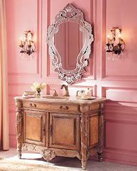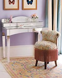 衛(wèi)生間里鋪地毯,實(shí)在是很奢侈的事情,因?yàn)榈靥悍浅N?,不過(guò)這一塊薄薄的花毯賦予極大的女性化色彩。同樣富于女性化色彩的還有那張鏡面化妝臺(tái),式樣簡(jiǎn)單,帶三個(gè)小抽屜可以放些小零小碎,臺(tái)面上再擺一小盆花。這套衛(wèi)生間家具的風(fēng)格十分歐式,尤其是那張流蘇小椅,其實(shí)這樣的潮流離我們已經(jīng)很近了。