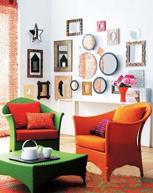 旅行時(shí)收集的裝飾框,不必為風(fēng)格、材質(zhì)和顏色的沖突而擔(dān)心,把它們鑲嵌上鏡子,集中展示在墻面上,保證成為居室中的亮點(diǎn)。