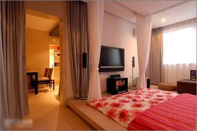 在擺放床的地域處,裝修出10公分左右高 的木質(zhì)“地臺”,相應(yīng)地選用較低矮的床。其效果是:使睡眠區(qū)的環(huán)境更為清潔;地臺烘托中的床與人更有一種“精品”的藝術(shù)美感;尤其是花梨木質(zhì)的地臺還可給人以芬芳的氣息。