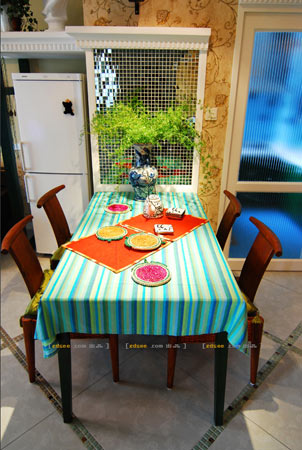廚房門口便是餐廳,鋪上綠色條紋桌布,再配上藤藤制餐椅和花瓶,營造了清爽舒適的環(huán)境。墻壁鋪貼了鏡子馬賽克,人在家中的活動(dòng)都能在鏡中顯現(xiàn),使居室有動(dòng)感和生機(jī)。