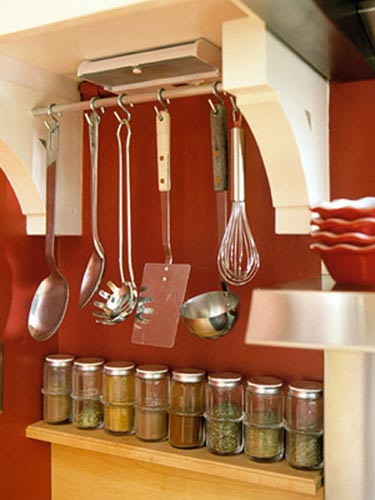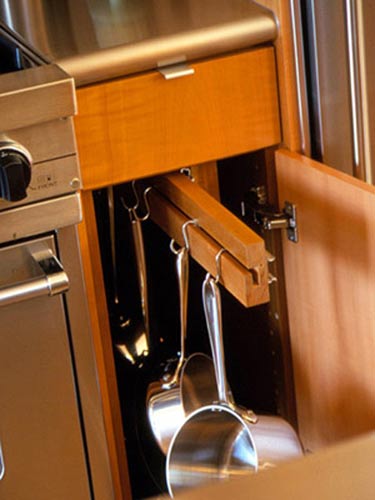如果墻壁或天花等不能安裝掛桿或支架,則可以考慮在櫥柜里安一個(gè)可抽拉的懸掛式掛桿。用來(lái)懸掛勺子、舀子等用具。