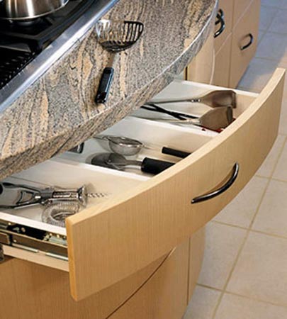 把抽屜分成幾個(gè)格子,用來(lái)分別存放小件的廚房用具。拉開(kāi)抽屜,一眼就能找到自己想要的東西。