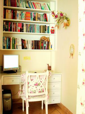 裝修后的立柱成了劃分客廳和書房區(qū)域的分界線,依立柱劃分左右兩個區(qū),左側是定做的長排大衣柜,柱子右側一個多平米的地盤則變成了"書房"。麻雀雖小五臟俱全,電腦桌、書架、吊柜全都有,當然了,家具尺寸都是依照電器尺寸量身定做的,不然哪里能活生生偷出1平米的空間呢?