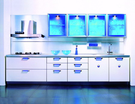 在造型上屬敞開式廚房,一字型櫥柜精致、流暢、溫馨,在色彩上更具時(shí)尚的韻味,在設(shè)計(jì)上體現(xiàn)人性化設(shè)計(jì)理念,而在功能配置上融入了更多的電器化、智能化科技含量。