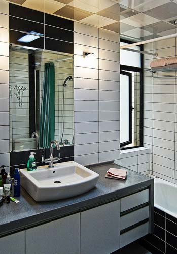 與淋浴間相對(duì)的墻面完全使用了鏡子,擴(kuò)大了小浴室的空間視覺感,鏡子前面做成了浴室架,上面安裝了臺(tái)式盆,這里可以梳洗打扮,邊上的綠色植物,成了整體設(shè)計(jì)中引人注目的亮點(diǎn),也為環(huán)境帶來了生氣。