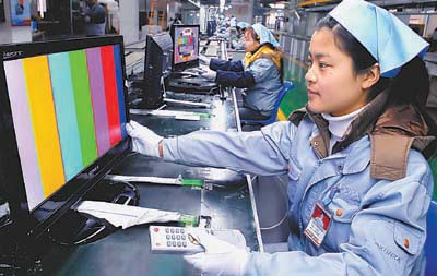 2月26日,安徽滁州,彩電生產(chǎn)線的員工正在檢測調(diào)試產(chǎn)品。王家國攝