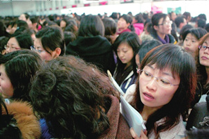 新華網(wǎng)北京3月4日電(記者 羅曉光)4日,北京市2009年女大學(xué)生專場招聘會在北京市畢業(yè)生就業(yè)市場舉辦,北京近50家企事業(yè)單位共推出600余個崗位,吸引了5000多名女大學(xué)生入場。