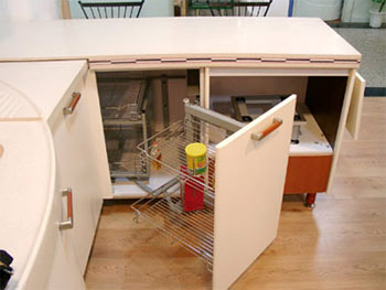 水槽下方的柜體空間很大,但空膛的利用率往往不高,因為有管道,不便于放擱板,要想有序地碼放東西,就要利用這種凹型抽屜拉籃,凹型口避讓了管道,寬大的抽屜讓取物更方便。