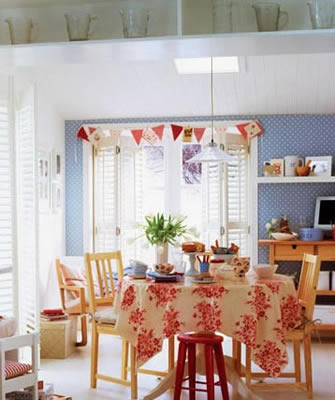 鮮明的白色、紅色和藍色將餐廳空間裝點得明凈、通透而又輕松寫意。新英格蘭風格的百葉窗門、圓點花樣的藍色壁紙和精制的白、紅色織物, 讓人輕易便歡快輕松起來,那一排孩童的卡片更是讓家庭的溫暖瞬時散發(fā)出來,令人陶醉。