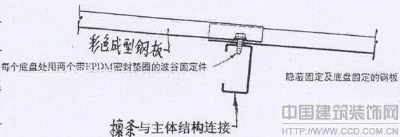 2.制作安裝方便快捷:成型幕墻的板塊,彩鋼板經冷作加工,其剛度優(yōu)于同厚度的鋁板。圖1表示彩鋼板幕墻安裝示意圖。