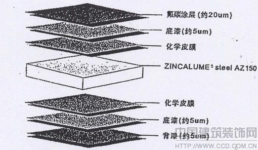 常熟市沃爾碼商業(yè)廣場項目金屬幕墻所采用的彩色鋼板為廣州博思格來實公司所生產的彩鋼板,其具有以下特點:彩鋼板抗腐蝕性能、防潮性能、抗粉化性能、抗化學性能均達到了一個較高水準。博思格來實公司的彩鋼板其基板為優(yōu)耐板,系鍍鋁鋅合金鍍層。涂復前進行特有的抗銹蝕化學鍍膜處理;正面底漆層,涂復厚度5μm的聚酯底漆;鋼板正面涂層采用KYNARORPVD涂層厚度為20μm;鋼板背面淺綠色涂層,其厚度為5μm;背面底漆層為5μm厚環(huán)氧基樹酯。涂層結構如圖2。