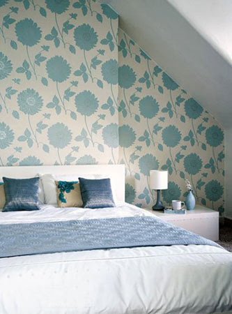 白底淺藍(lán)色向日葵圖案的Crowson墻紙賞心悅目。床架和儲(chǔ)藏格均來(lái)自宜家,被子和床罩自然也是清新的淡藍(lán)色。床頭藍(lán)色Lurex小靠墊和Pistachio藍(lán)花小靠墊隨意擺放,窗邊小桌上,藍(lán)色底座白色燈罩的Marlene臺(tái)燈與Matalan花瓶繼續(xù)將藍(lán)色進(jìn)行到底,藍(lán)色成為整個(gè)房間的主宰,既淡雅又充滿情趣。