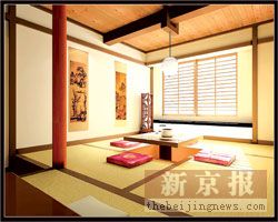 在設(shè)計(jì)中,客廳的坐墊是絲綢的,而且印有中國(guó)傳統(tǒng)圖案;墻上掛的是中國(guó)山水風(fēng)景畫(huà),做成一種似是而非的屏風(fēng)感覺(jué);墻邊擺設(shè)的是古老的帶銅扣的兩扇門(mén)的中式柜子,柜子的線條中規(guī)中矩,四平八穩(wěn),里面可以放茶具之類(lèi)的東西;設(shè)計(jì)窗簾用草簾子,以便與房間整個(gè)的實(shí)木風(fēng)格統(tǒng)一。