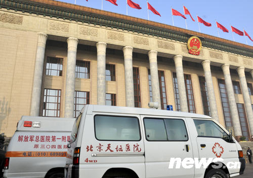 人民大會堂紅旗飄飄迎接兩會(陳濤 攝)
