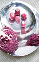 選擇的蔬果能否表現(xiàn)出美感,很大程度上取決于與容器的組合是否協(xié)調(diào)。這種協(xié)調(diào)感不單是指顏色、形狀,還有質(zhì)感上的協(xié)調(diào)。例如水分大、葉狀的蔬菜,首選是玻璃器皿,二者結(jié)合更加突出蔬菜的鮮活,玻璃的清透。而水分少的果實類蔬果與木質(zhì)容器的搭配則可以使二者相得益彰。