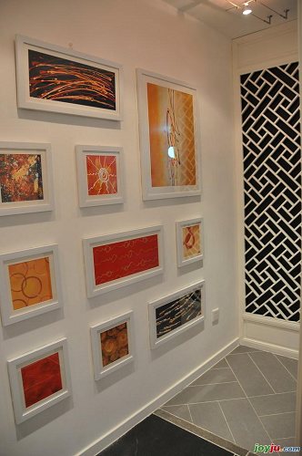白色花板在后面黑色柜子的襯托下是不是很不錯(cuò)呢!和這個(gè)中式花板相對(duì)比的是那一墻的壁畫(huà)!這些畫(huà)都是抽象的油畫(huà),它們不是畫(huà)在紙上的,而是畫(huà)在畫(huà)布上的。這里就體現(xiàn)了我說(shuō)的:中西合璧,古現(xiàn)結(jié)合!
