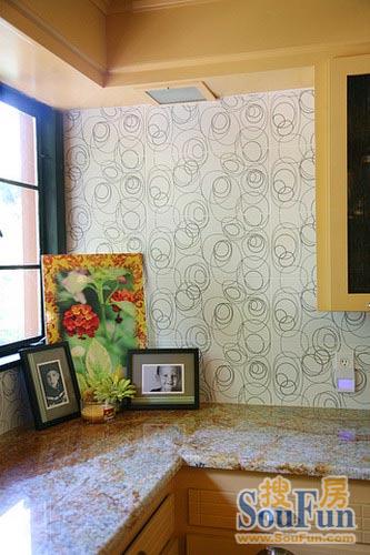 廚房的一角——帶有棕色花紋的大理石臺(tái)面皎潔省會(huì),抽象的壁紙?bào)w現(xiàn)出主人的品味。細(xì)節(jié)裝飾在那個(gè)空間都有體現(xiàn),是女性家居的特質(zhì)。簡(jiǎn)單的畫作與孩子的相框點(diǎn)綴出家的溫馨。