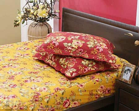 黃色為底床罩+紅色花朵靠枕一幅田園氣息在臥室洋溢。以一種恬淡陶然的田園情懷再現(xiàn)精致浪漫的都市品質(zhì)生活:聞著空氣中彌漫著愛的氣息,那一份溫馨,那一份感動(dòng),盡在這一瞬間。空間,因?yàn)榈玫结尫哦始姵省?